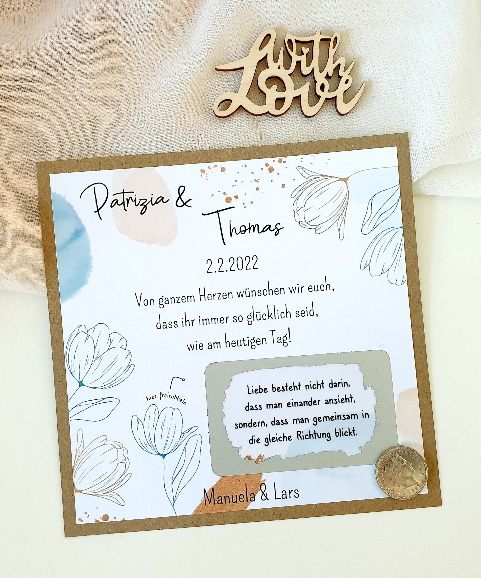 Bitte Vornamen des Brautpaares, Datum der Hochzeit, sowie Name(n) des Absenders angeben.