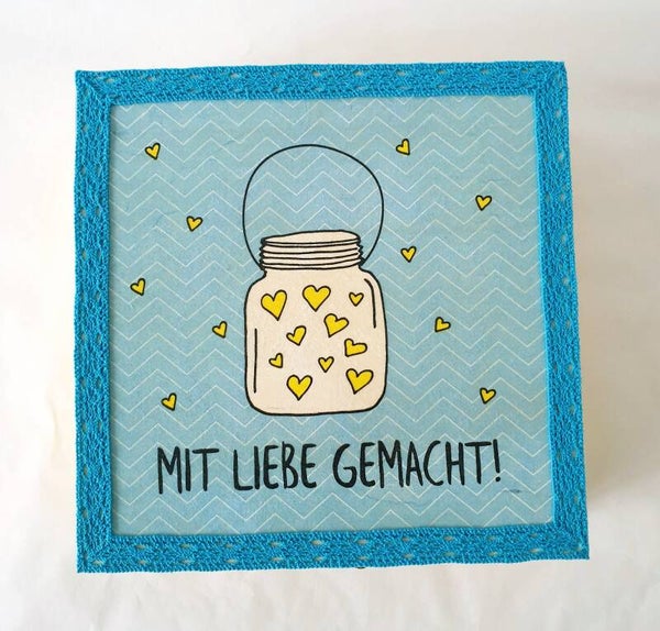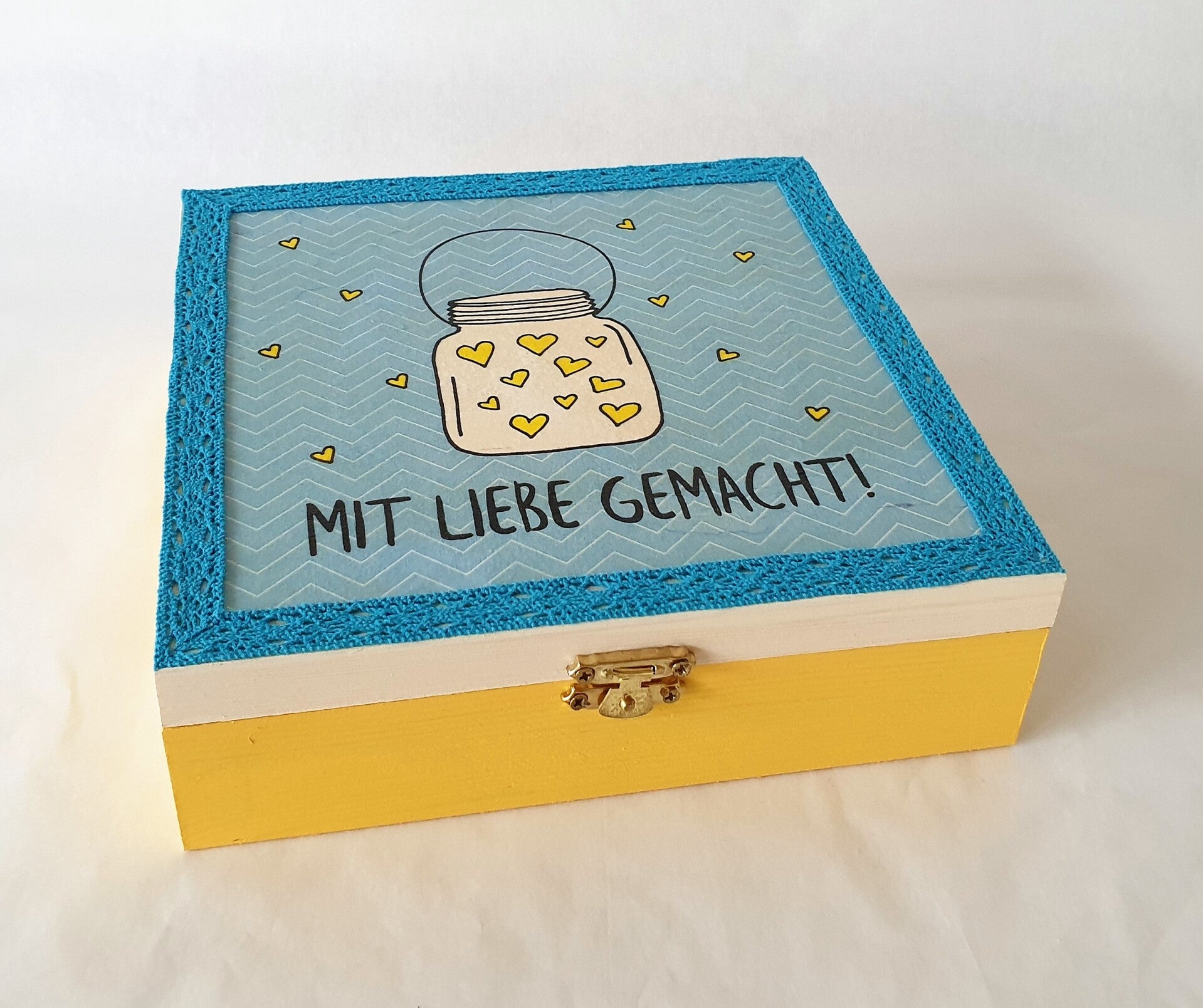 Die Box aus Holz wurde mit Acryl- und/oder Kreidefarbe bemalt und mit der Serviettentechnik in liebevoller Handarbeit dekoriert.
