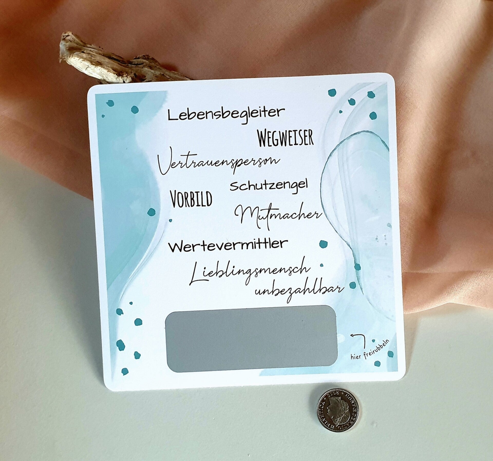 Beim Rubbeltext handelt es sich um einen Vorschlag. Gerne darfst du mir deinen Wunschtext mitteilen. Machst du das nicht, übernehme ich diesen Vorschlag, ohne Name des Empfängers.
