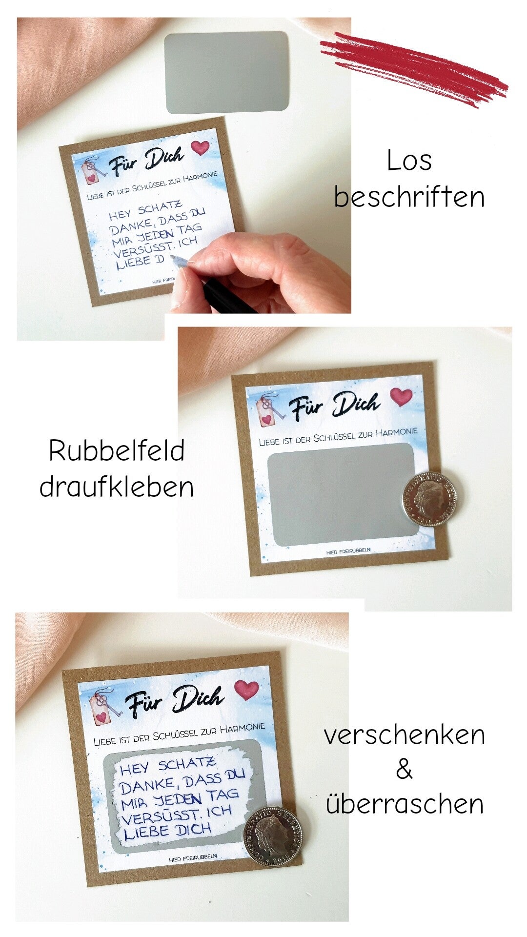 Du schreibst deinen Text aufs Los und klebst das Rubbelfeld anschliessend darauf und schon ist die Überraschung fertig.