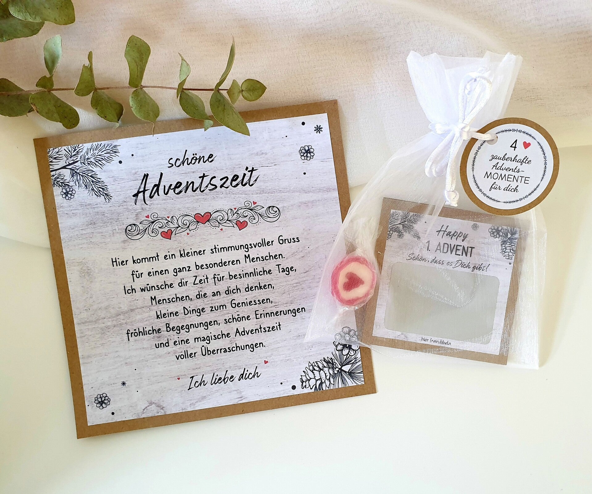 Neu gibt es diesen maximal entschleunigten Adventskalender mit VIER statt 24 Lose. Ein tolles Geschenk, das du deinen Liebsten an den vier Adventssonntagen machen kannst. An jedem Advents-Wochenende wird ein Los freigerubbelt.