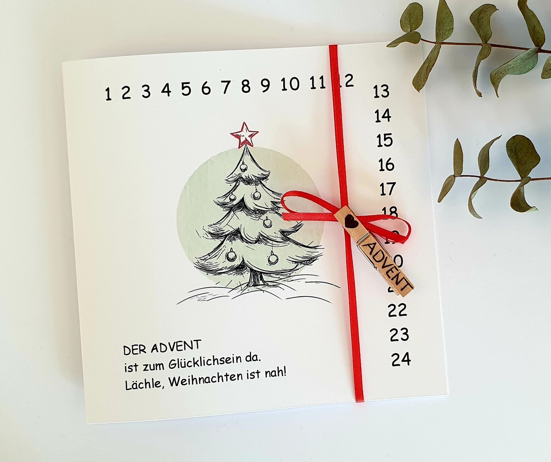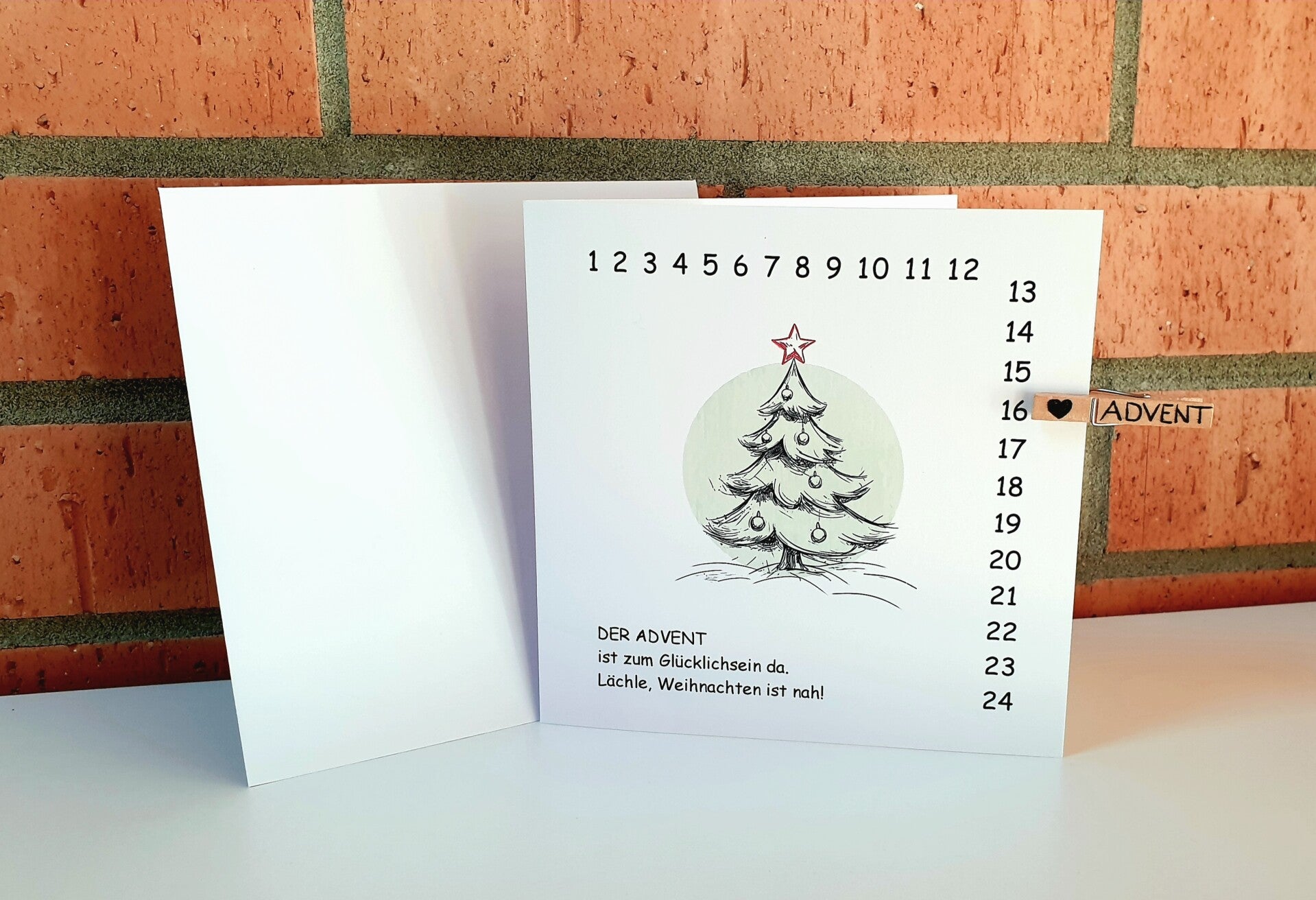 Jeden Tag im Advent können deine Liebsten die Klammer eine Zahl weiterstellen und die Vorfreude auf Weihnachten in vollen Zügen geniessen. Die Karte lässt sich aufstellen und ist ein Highlight für die schönste Zeit des Jahres.