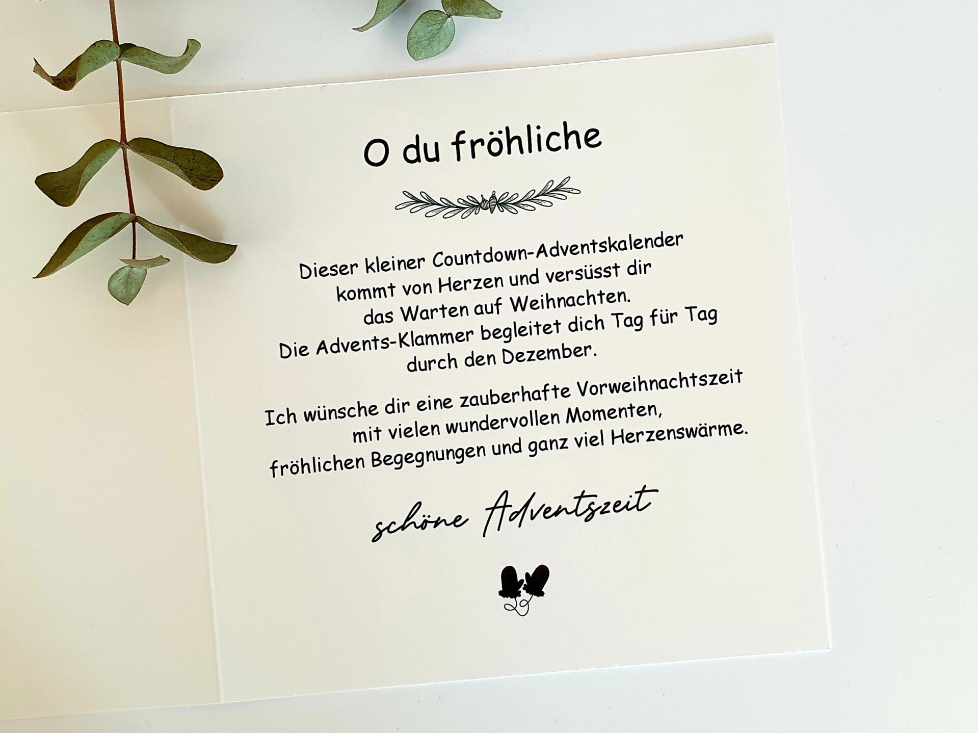Jeden Tag im Advent können deine Liebsten die Klammer eine Zahl weiterstellen und die Vorfreude auf Weihnachten in vollen Zügen geniessen. Die Karte lässt sich aufstellen und ist ein Highlight für die schönste Zeit des Jahres.