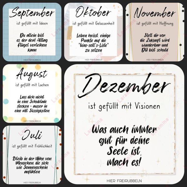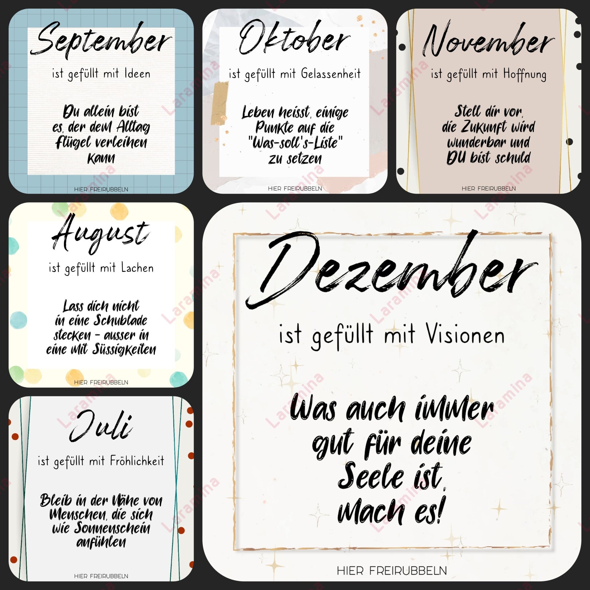 Dieser tolle Jahreskalender bereitet jeden Monat grosse Freude, ein Kalender mit Überraschungseffekt, genialen Lebensmottos und humorvolle Botschaften, die erfrischen.