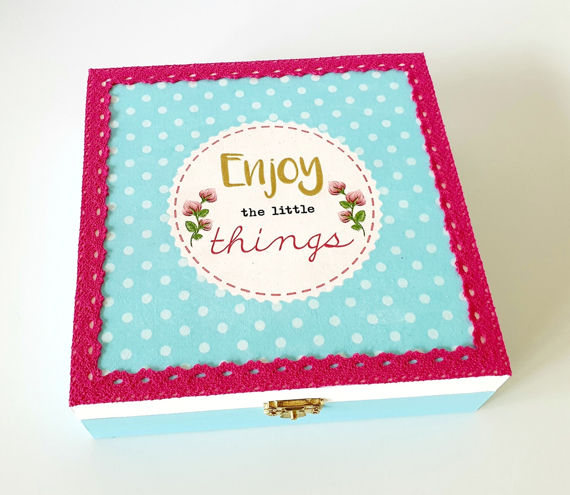 Die Box aus Holz wurde mit Acryl- und/oder Kreidefarbe bemalt und mit der Serviettentechnik in liebevoller Handarbeit dekoriert.